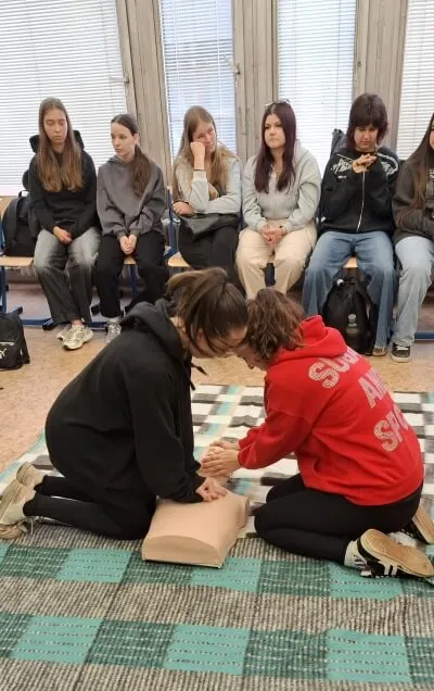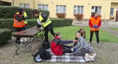 Ve středu 24. září 2025 se žáci devátých tříd účastnili soutěže družstev v první pomoci, kterou již tradičně organizuje SSZŠ Mělník. Tato soutěž je velmi náročná. Soutěžící musí přímo ve městě na daných stanovištích, která jsou reálně a autenticky připravena, vyhodnotit danou situaci a správně poskytnou první pomoc zraněným.