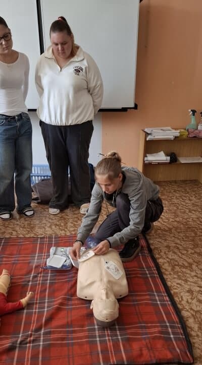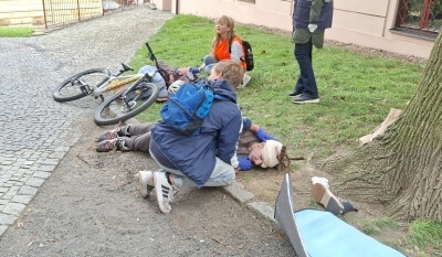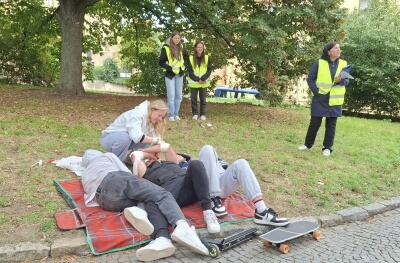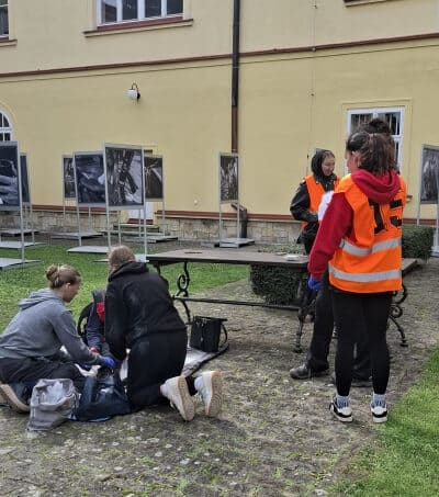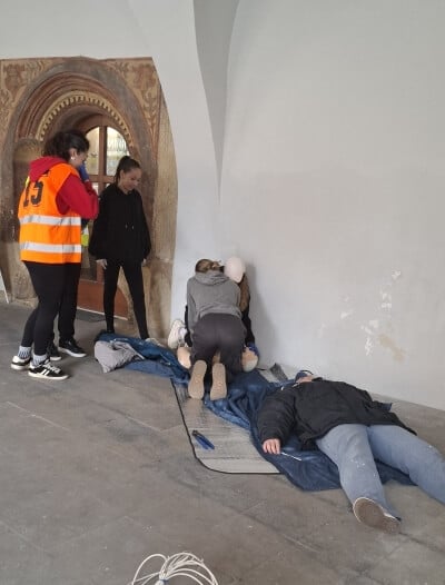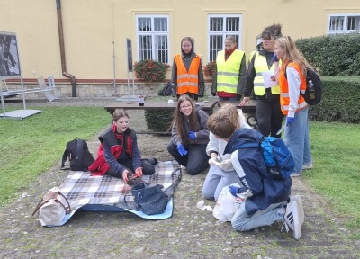Ve středu 24. září 2025 se žáci devátých tříd účastnili soutěže družstev v první pomoci, kterou již tradičně organizuje SSZŠ Mělník. Tato soutěž je velmi náročná. Soutěžící musí přímo ve městě na daných stanovištích, která jsou reálně a autenticky připravena, vyhodnotit danou situaci a správně poskytnou první pomoc zraněným.